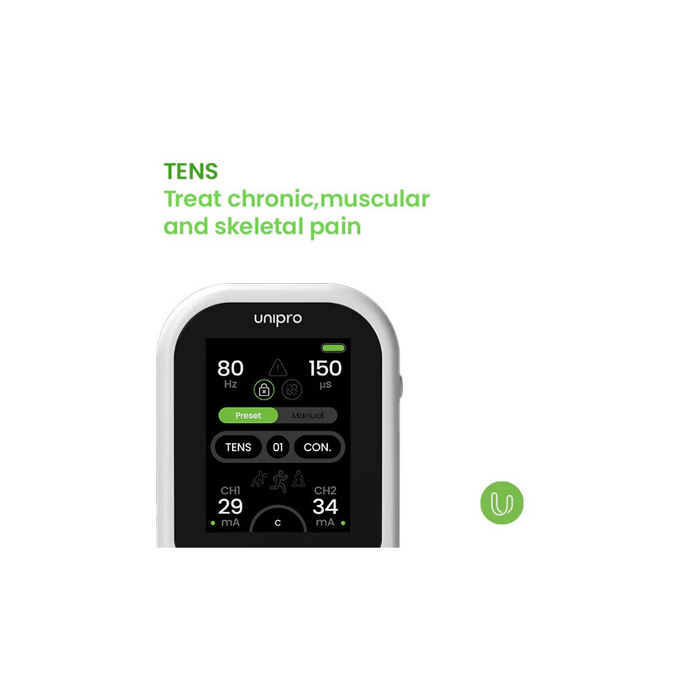 Unipro is a multitherapy medical device that combines the treatment capabilities of TENS, EMS, Microcurrent and Interferential Stimulation.