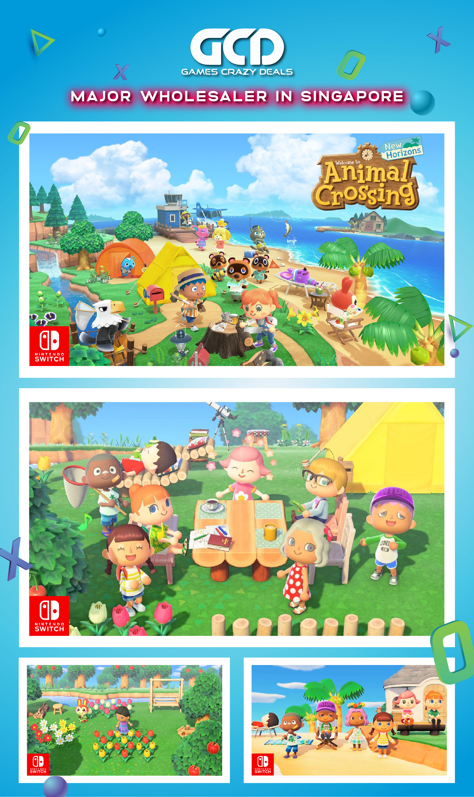 Escape to a deserted island and create your own paradise as you explore, create, and customize in the Animal Crossing: New Horizons game. Your island getaway has a wealth of natural resources that can be used to craft everything from tools to creature comforts. You can hunt down insects at the crack of dawn, decorate your paradise throughout the day, or enjoy sunset on the beach while fishing in the ocean. The time of day and season match real life, so each day on your island is a chance to check in and find new surprises all year round.Show off your island utopia to family and friends—or pack your bags and visit theirs. Whether playing online* or with others beside you**, island living is even better when you can share it. Even without hopping on a flight, you’ll meet a cast of charming animal residents bursting with personality. Friendly faces like Tom Nook and Isabelle will lend their services and happily help you grow your budding community. Escape to your island getaway—however, whenever, and wherever you want.