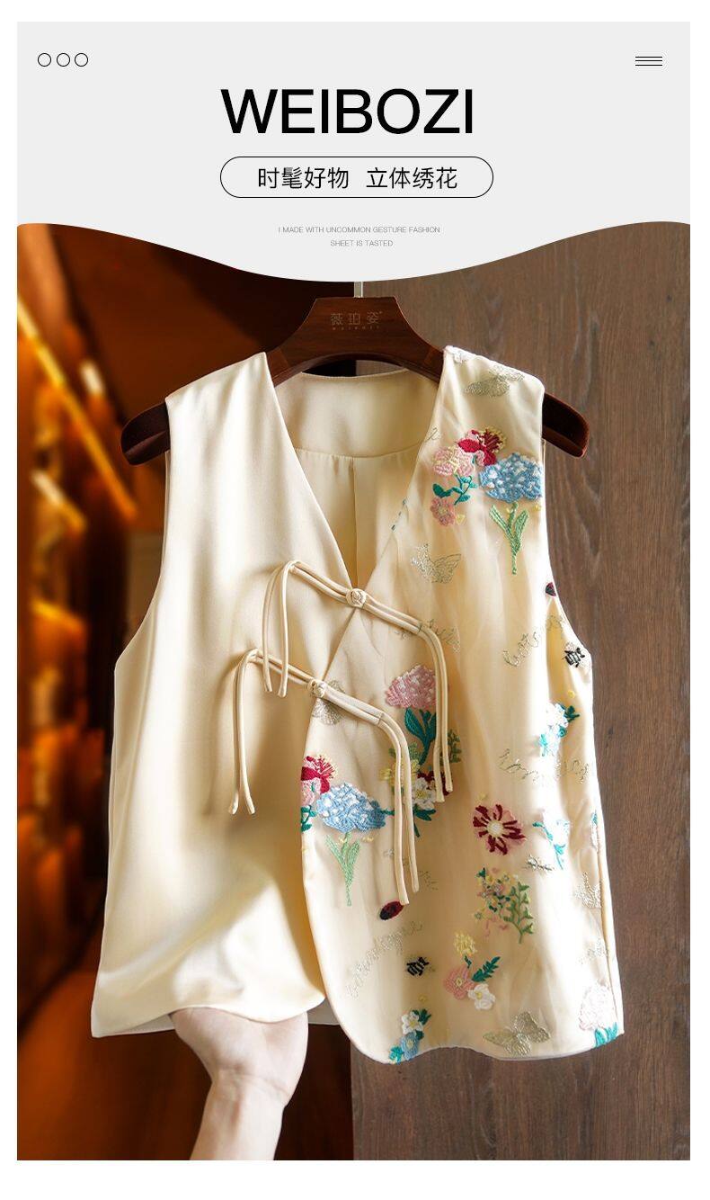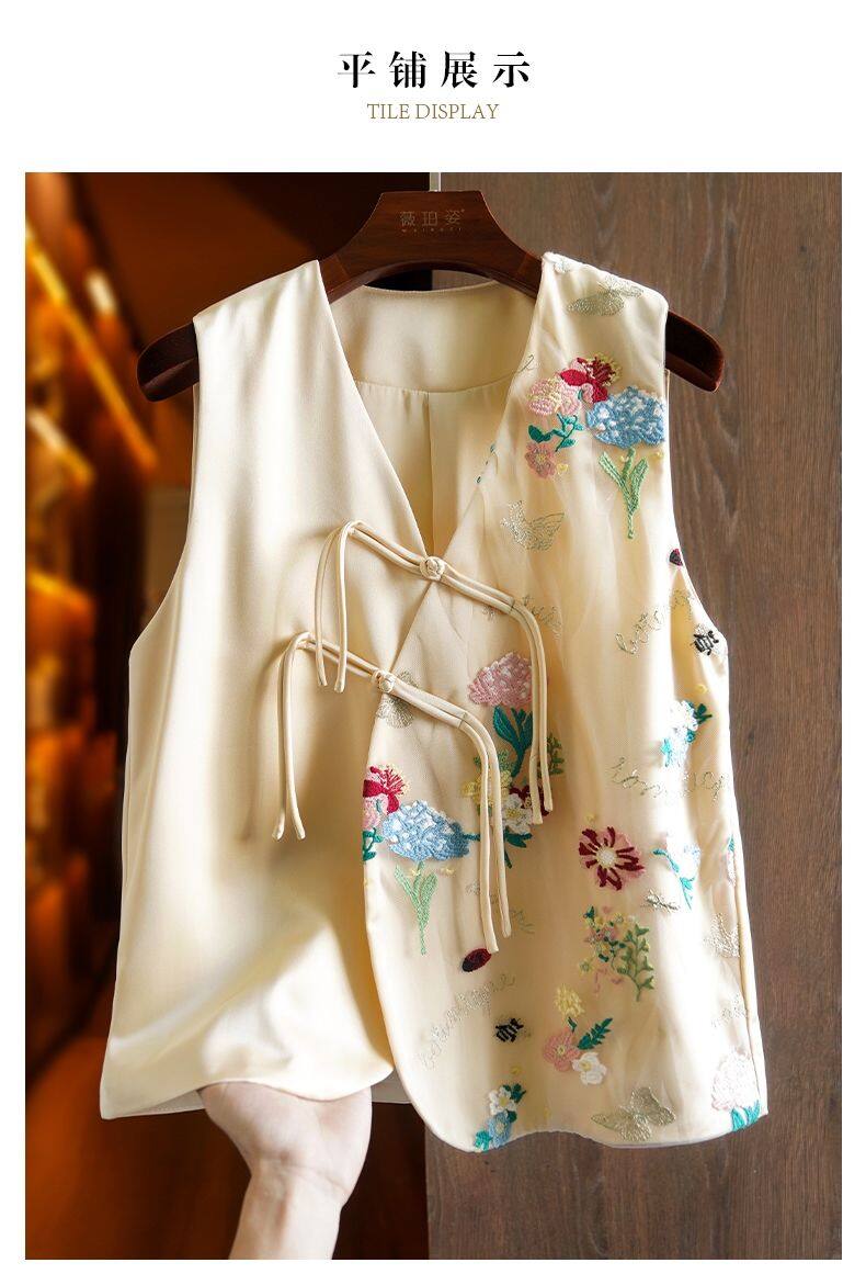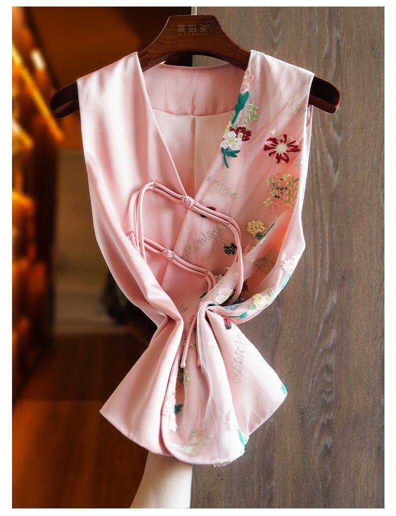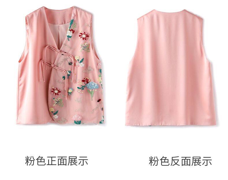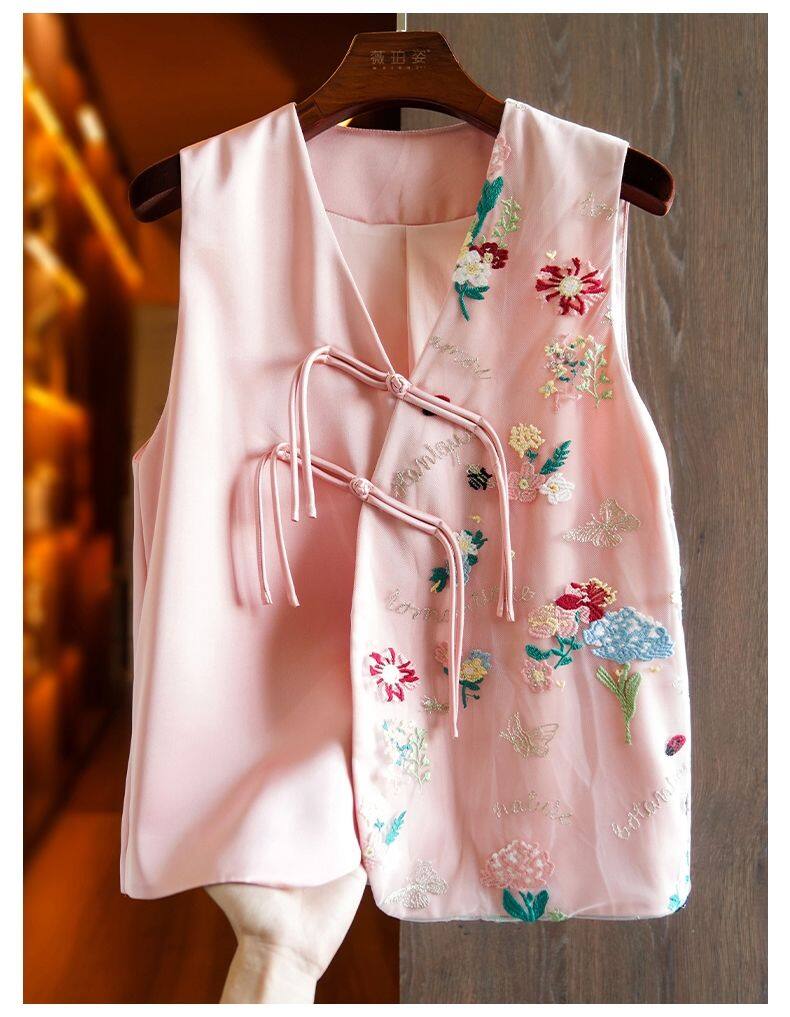 Joso Apricot Pink Senior Sense of Summer Chinese Vest Women Summer Suit Original Design Mesh Embroidery Country Tide Wind Plate Buckle Top