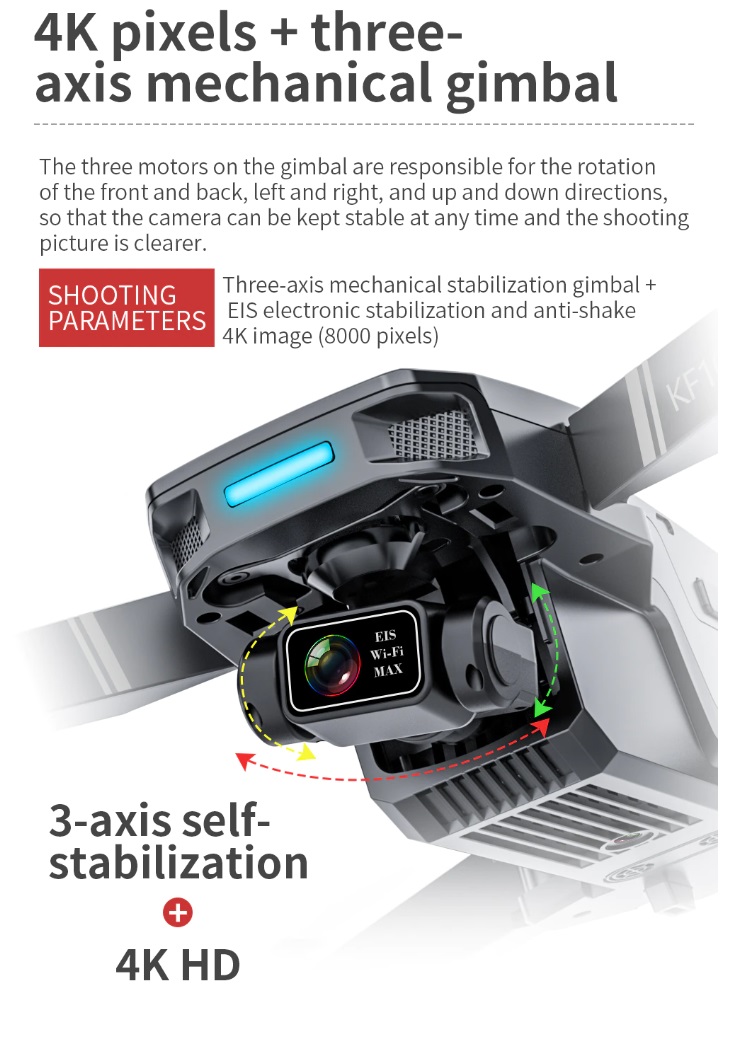 Item No: KF101 MAX Color :Dark Grey Frequency :2.4G (Remote Control) & 5G (Mobile Phone) Drone Battery :11.1V 2500mAh Control Distance : 3KM For KF101 MAX Wifi Image Transmission Distance : 3KM Flight Time : About 25 min Charging Time : About 6 hours USB Charging : 5V/2A Drone Weight : 613g (Needs drone registration in Singapore) Remote Control Battery : 3.7V 1000mAh Transmitter Charging Time : About 60min Transmitter Operating Time : About 10 hours Camera : 3 -Axis Electronic Stabilization Gimbal EIS electronic image stabilization Camera Camera Lens : 120° Photo Resolution (APP) : 3840*2160 P Video Resolution (APP) : 1280*720 P Photo Resolution (SD Card) : 2560*1440 P Video Resolution (SD Card) : 2560*1440 P Frame Rate : 30fps Photo Format : JPG Video Format : MP4 or AVI Adjustable Angle :90° Gesture Shooting : 1-3 M GPS Follow Me : 30 M+ SD Card Supports 32G-128G(Not Included) Mobile Device System Version : iOS 8.0 or later / Android 4.4.4 or later